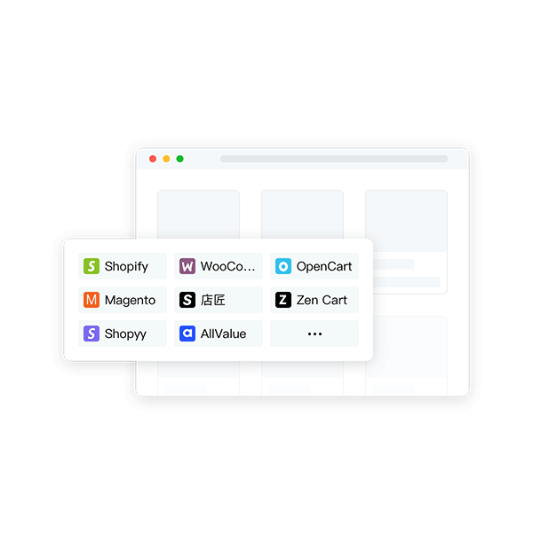 与 Shopify、WooCommerce、OpenCart、Magento、店匠、Zen Cart、Shopyy、有赞 AllValue 等主流建站平台建立合作,助您开启跨境电商出海之旅